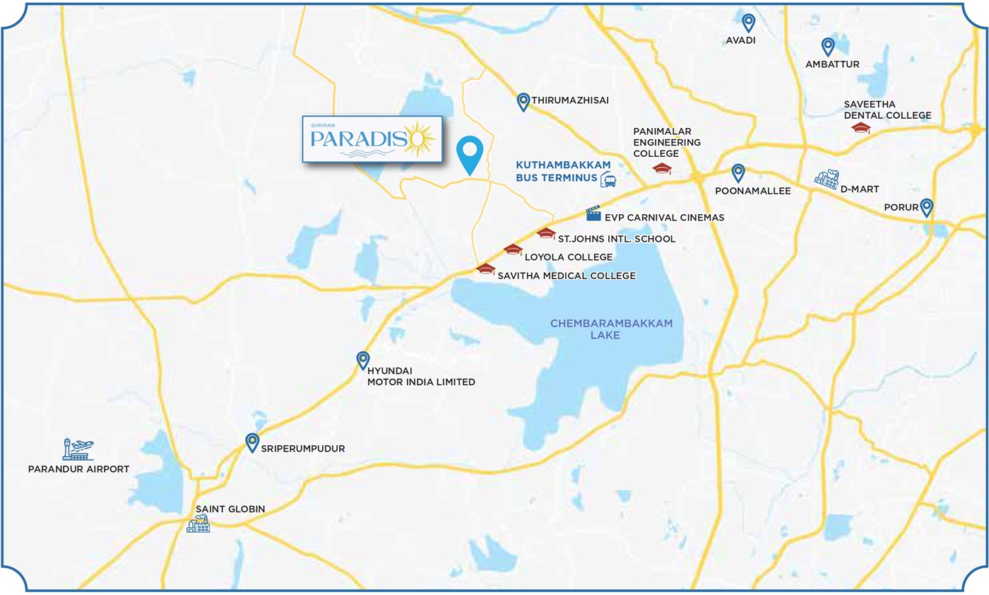 Shriram Paradiso is a residential project located in Kuthambakkam, Chennai. This area, situated on the outskirts of Chennai, has been gaining attention for its developing infrastructure and relatively tranquil environment compared to the bustling city center.Shriram Paradiso is part of the Shriram Properties portfolio, which is known for its residential and commercial developments. This project typically features modern amenities, landscaped gardens, and a range of housing options designed to cater to various preferences and needs.Being a RERA-registered society, the project details and other important information is also available on state RERA portal. The RERA registration number of this project is TN/02/Building/0319/2023.